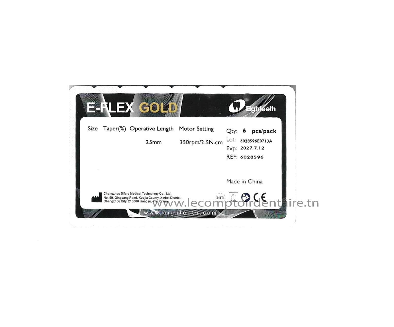 Les limes E-Flex Gold sont fabriquées à partir d’un alliage NiTi breveté, bénéficiant d’un traitement thermique exclusif assurant performance, flexibilité et sécurité lors des traitements endodontiques.